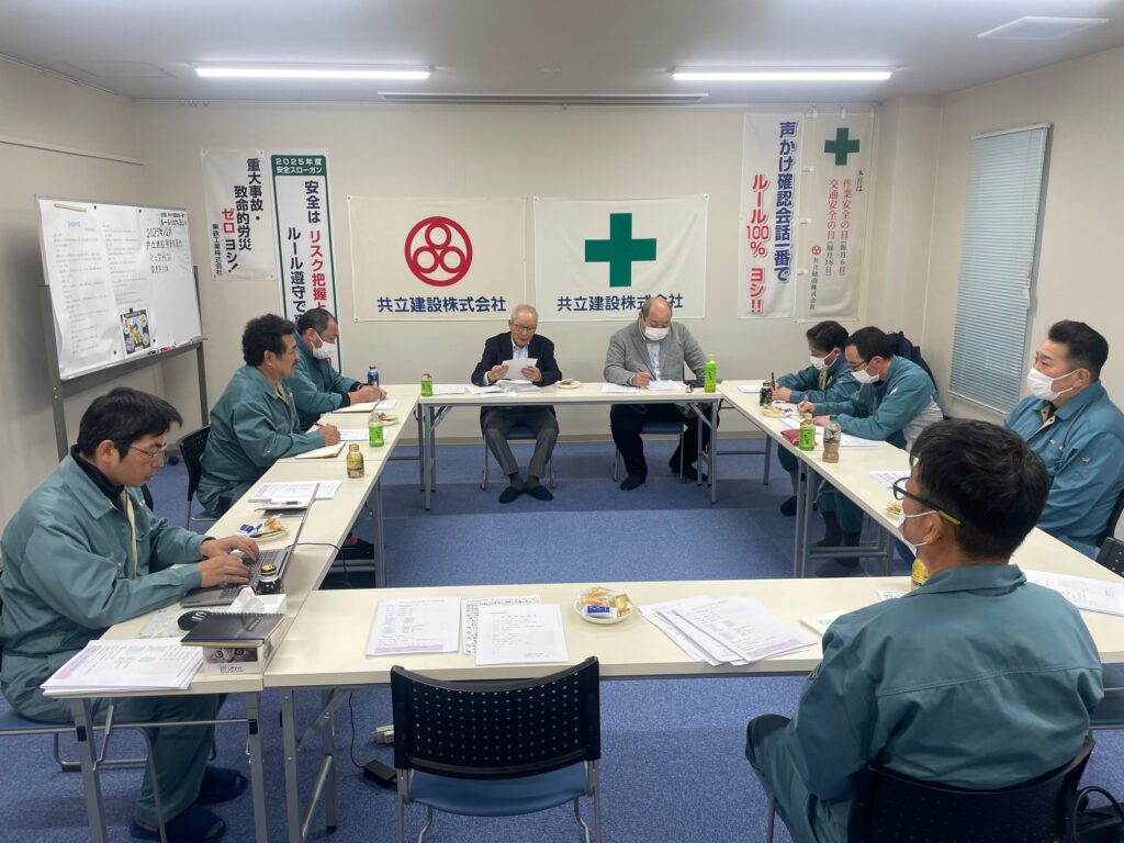千田次長から、共立建設全体で若手社員が増える一方、トラブルの原因には声掛け不足や指導不足が目立ちました。冬季に向けては、火気の取扱いに注意し散水だけでなく消火器の準備・管理もするとお話がありました。